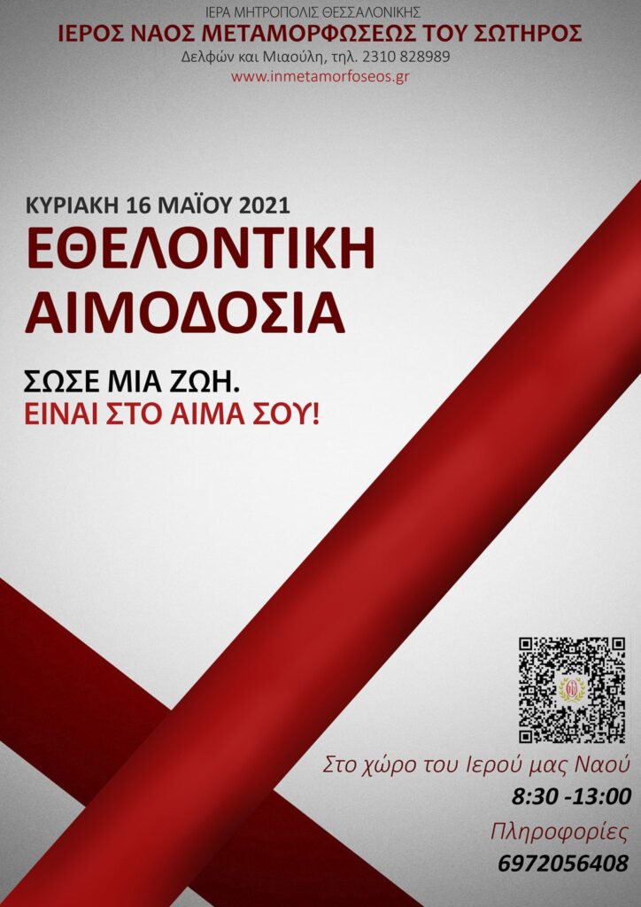 Αιμοδοσία Μάιου 2021Κυριακή 16 Μαΐου 2021 Τοποθεσία: Στο χώρο του Ιερού μας Ναού Ώρα: 8:30 – 13:00 Πληροφορίες: 6972056408