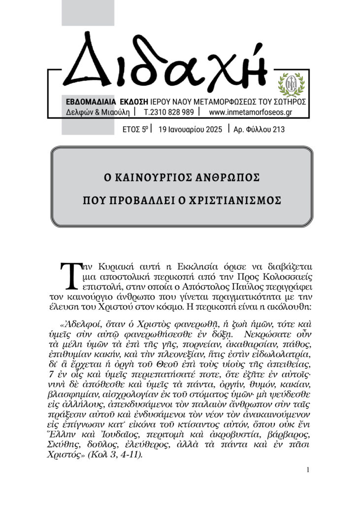 Ο ΚΑΙΝΟΥΡΓΙΟΣ ΑΝΘΡΩΠΟΣ ΠΟΥ ΠΡΟΒΑΛΛΕΙ Ο ΧΡΙΣΤΙΑΝΙΣΜΟΣ Την Κυριακή αυτή η Εκκλησία όρισε να διαβάζεται μια αποστολική περικοπή από την Προς Κολοσσαείς επιστολή, στην οποία ο Απόστολος Παύλος περιγράφει τον καινούργιο άνθρωπο που γίνεται πραγματικότητα με την έλευση του Χριστού στον κόσμο. Η περικοπή είναι η ακόλουθη: «Ἀδελφοί, ὅταν ὁ Χριστὸς φανερωθῇ, ἡ ζωὴ […]